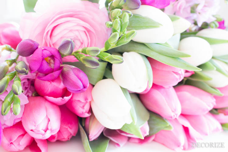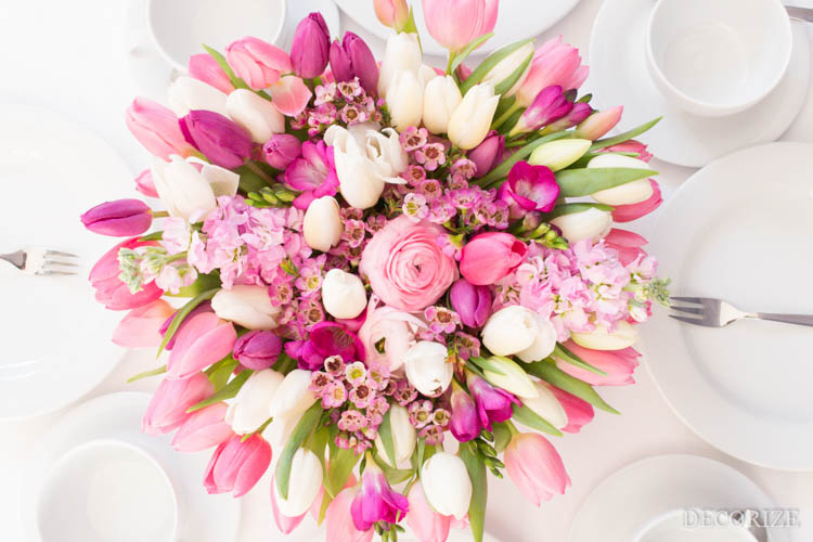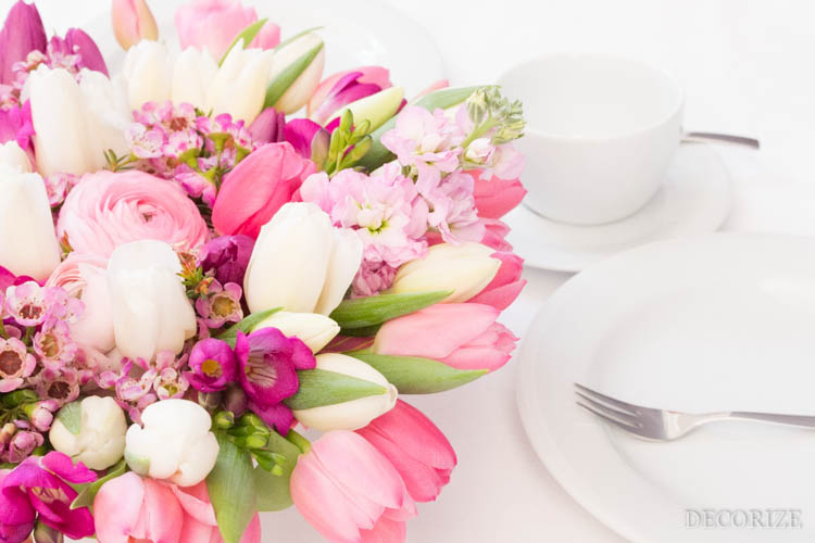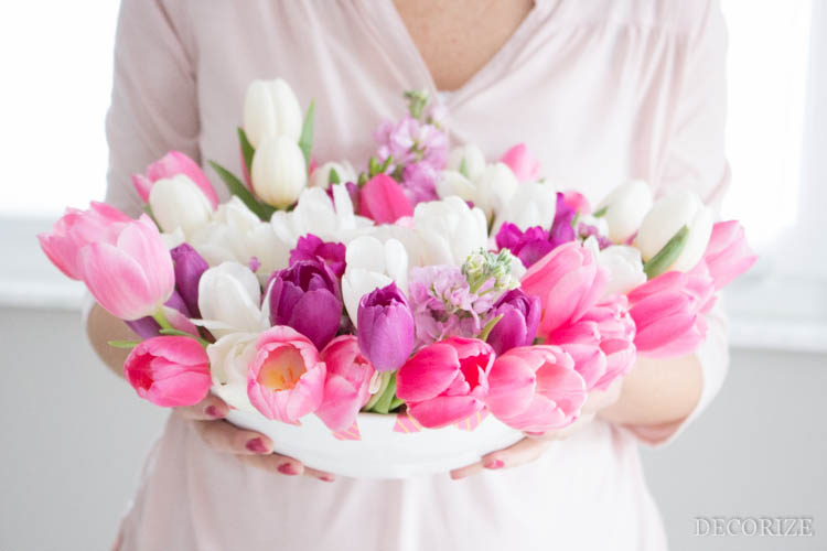 Wir haben für unsere Blumenschale frisch-fröhliche Pink- und Rosatöne genommen und mit weißen und violetten Tulpen kombiniert. Mädchenfarben, musste sein, sorry Männer. Wir würden euch total gern sagen, wie die anderen hübschen Blumen auf dem Bild alle heißen, aber wir haben leider nicht die geringste Ahnung. Im Blumenladen zeigen wir immer nur mit dem Finger drauf und sagen “davon bitte” und “oh ja von denen auch noch bitte”. Tulpen können wir uns merken und dann hörts auch schon auf :-)