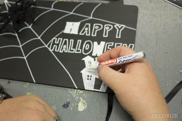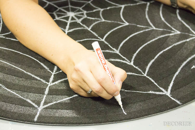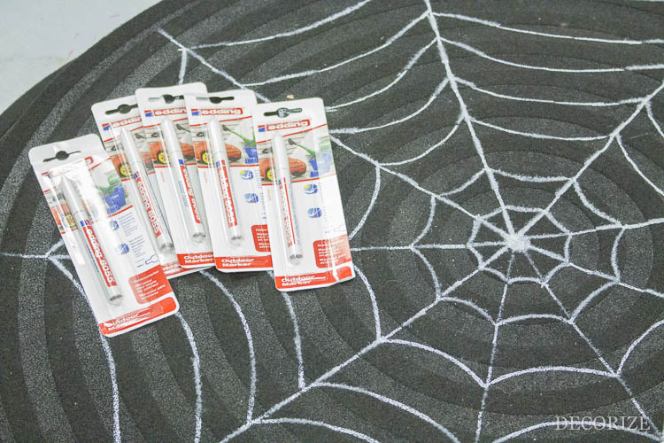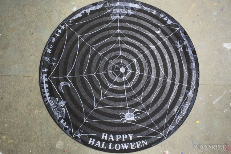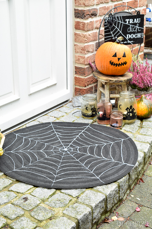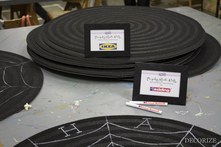 Die Designer von IKEA waren so freundlich und haben sich vor einiger Zeit (und vermutlich extra und nur für uns :-)) eine rabenschwarze, kreisrunde Fußmatte ausgedacht. “Tvis” heißt das gute Stück und schreit förmlich danach, weiß bemalt und beschriftet und zum Spinnennetz zu werden. Dafür nimmt man am besten die weißen Outdoor-Marker von edding und los geht’s! Mit einer Buchstaben-Schablone oder auch frei Hand, kann man dann noch “Happy Halloween” oder den Familien-Namen auf die Matte schreiben und, wenn man Lust und Laune hat, auch noch Kürbisse, Gruselschlösser und Spinnen hereinmalen. Die Mädels vor Ort waren wie im Rausch und haben zum Teil ganze Landschaften auf die Matten gemalt, wir waren begeistert!