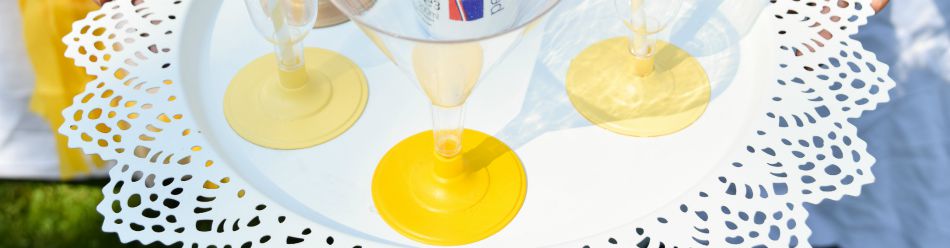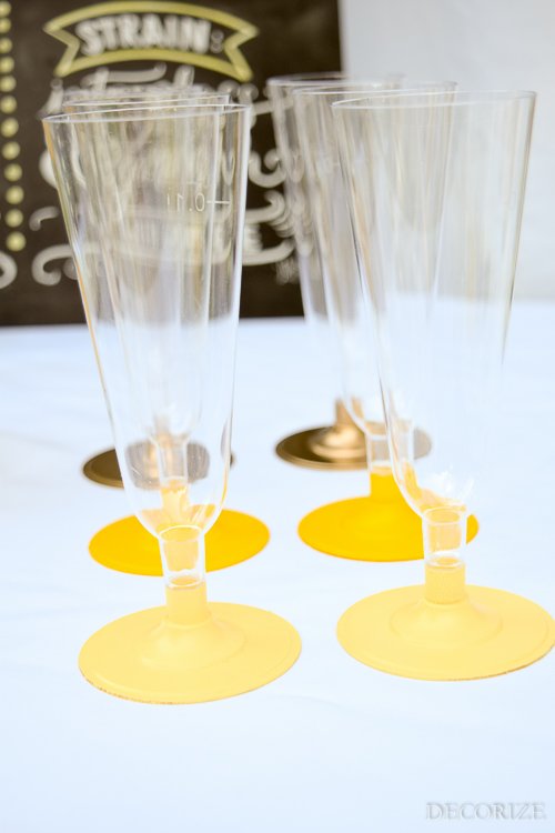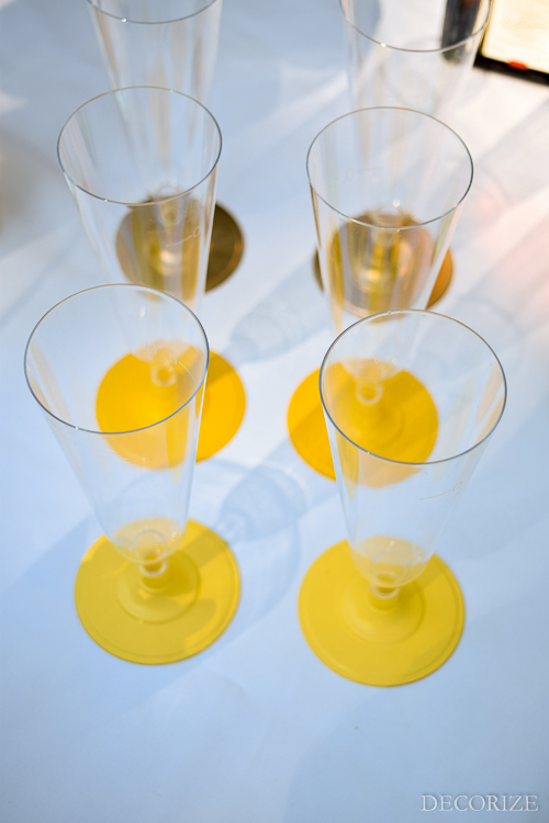 Habt ihr eigentlich neulich auf unserem Cocktailstand die Einweg-Plastik-Gläser gesehen, die da so schüchtern herumstanden? Die mit den hübsch gelb und goldenen Füßen, passend zur restlichen zitronengelben Sommer-Deko? Diese kleinen Plastik-Freunde hatten nicht von Haus aus gelbes Schuhwerk an, sondern wir haben es ihnen mit ein wenig Sprühfarbe verpasst!