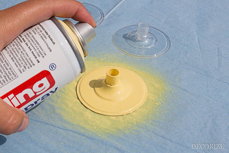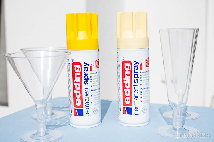 Als großer Fan der Permanent Sprays unseres Partners edding haben wir sie auch hierfür wieder zur Hand genommen und einfach mal in Quietsch-Gelb, Pastell-Gelb und Gold drauf losgesprüht. Das tolle an den Plastik-Cocktailgläsern ist ja, dass ihre Füße abnehmbar sind. Das heißt, man brauch nicht mal was abkleben sondern kann einfach sofort loslegen. Papiertischdecke o.ä. drunterlegen, Füße abnehmen, Dose schütteln und ab geht die Sprühdose!