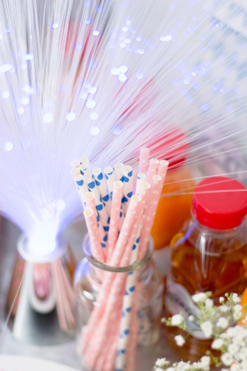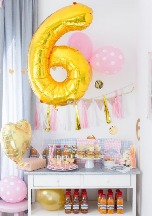 Als Deko hat sie mit einem Motivlocher weiße und goldene Sterne und Herzen ausgestanzt und mit der Nähmaschine zu ewig langen Girlanden vernäht und nach dem Aufhängen mit goldenen Luftschlangen umwickelt. Klasse Idee finden wir! Die ausgestanzten Sterne und Herzen wurden gleichzeitig noch als Cupcake-Topper verwendet und alles glitzerte wunderschön.