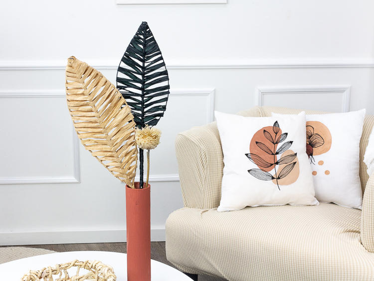 Naturmaterialien sind zur Zeit ja nicht wegzudenken im Interior! Bambus, Rattan, Sisal… wir sind schwer in love und besonders Bast und Maisschnur haben es uns als Naturmaterialien für DIY-Projekte angetan! So wie dieses Bast-Blatt, das sich sowohl in Natur als auch in Schwarz super gut in der Vase macht und ein bisschen minimalistischen Boho-Style in die Wohnung bringt, oder?