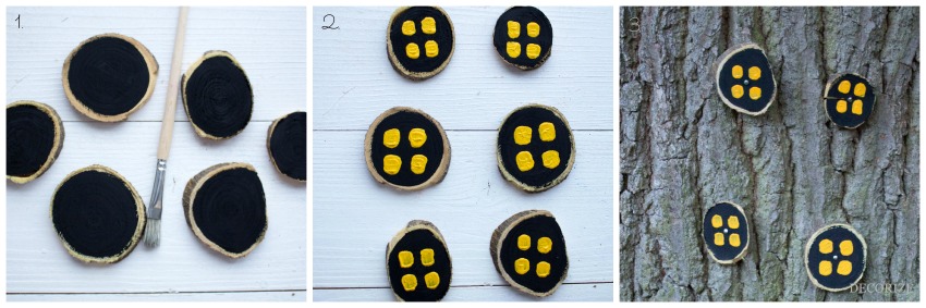 Die Fensterchen haben wir, nachdem sie getrocknet waren, mit kleinen Nägeln an der Baumrinde befestigt. Kleiner Tipp: nehmt unbedingt dünne Holznägel und nicht wie ich die erstbesten, die euch in die Finger kommen. Denn wie der aufmerksame Betrachter vielleicht bemerkt hat, sind von den 6 bemalten Holzscheiben nur 4 tatsächlich am Baum gelandet. Die anderen beiden sind beim Einschlagen des (zu dicken) Nagels leider in der Mitte zerbrochen. Das geplante dreigeschossige Baumhaus ist daher am Ende nur zweigeschossig geworden.