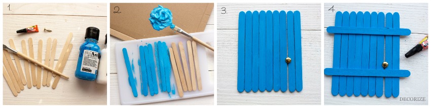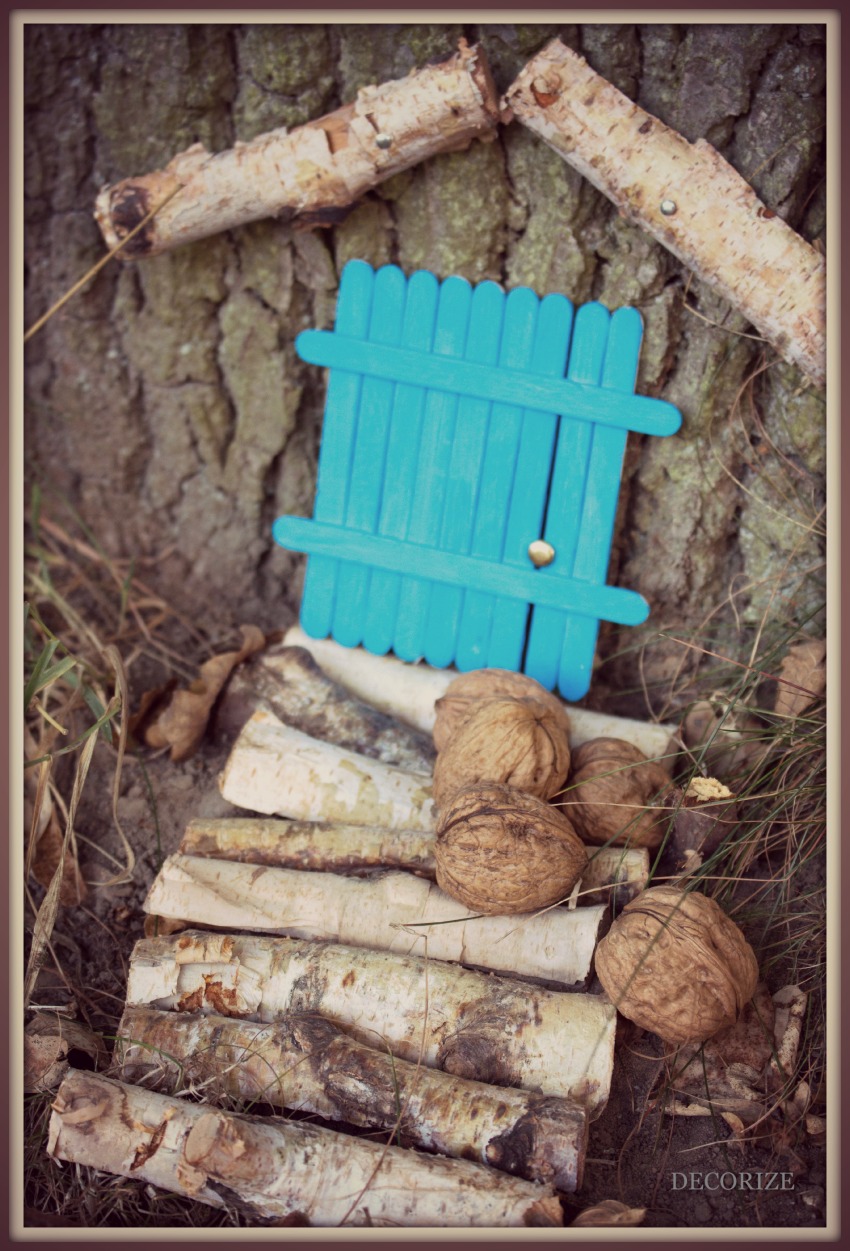 Die Tür haben wir aus einfachen Eisstielen gebaut, welche wir vorher kurz blau angemalt haben. Als Türknauf dient ein kleiner Briefknopf, der einfach zwischen zwei Stiele gelegt und hinten umgeklappt wird. Zusammengehalten werden die vielen Stiele durch 2 weitere, welche quer darüber gelegt und mit Sekundenkleber auf den anderen fixiert werden. Schwupps und fertig schon ist die Eingangstür.