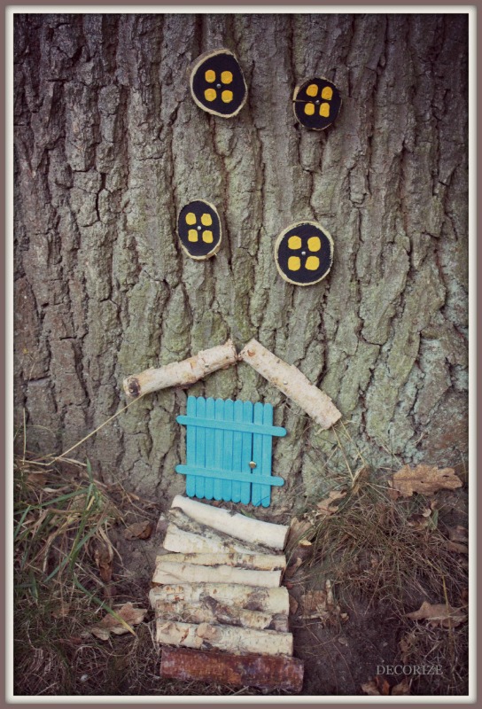 Für ein bisschen Gemütlichkeit haben wir aus kleinen Birkenstöckchen noch einen Eingangsweg zur Tür gelegt und einen Dachüberstand befestigt.