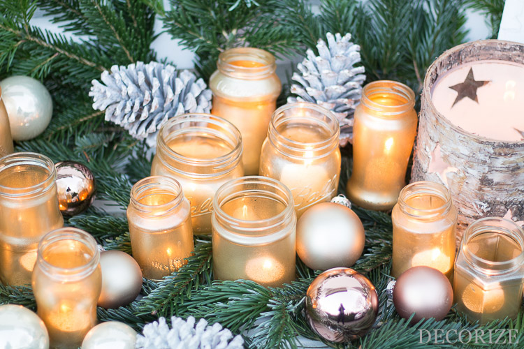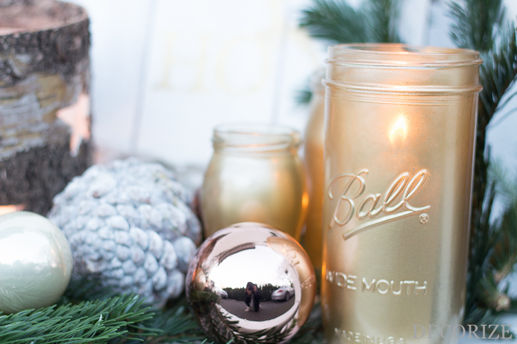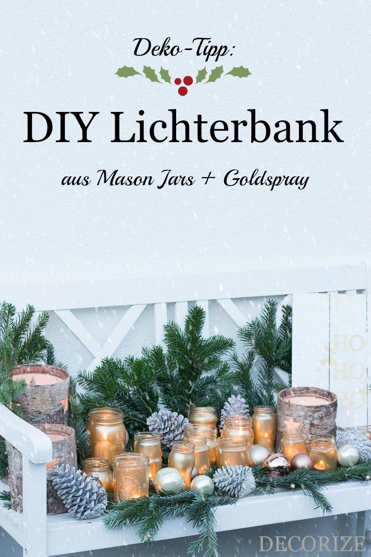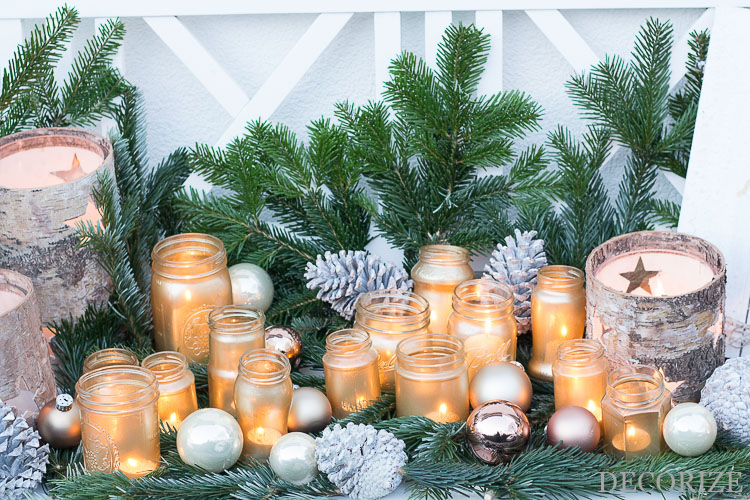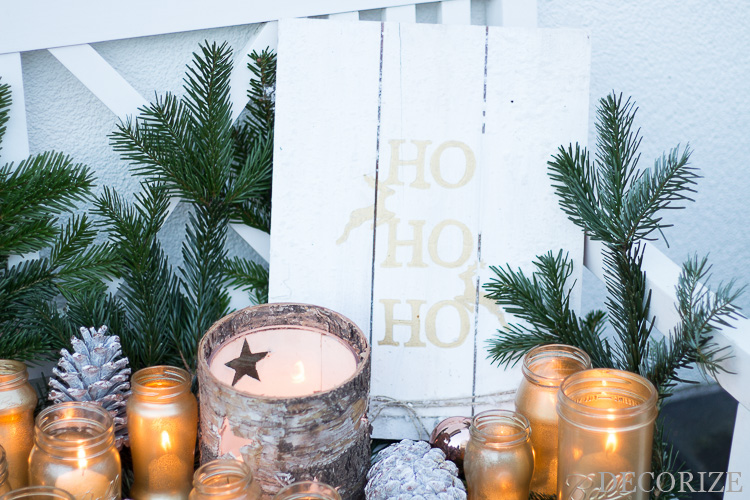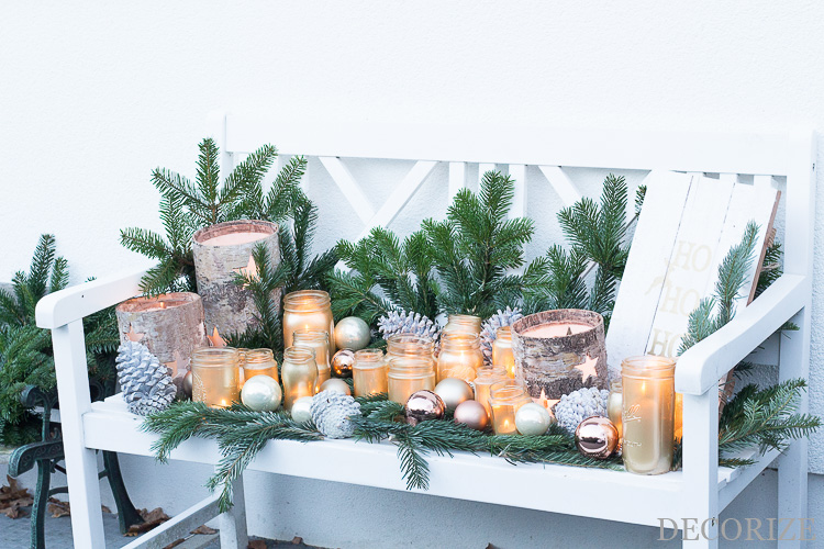 Die gold angesprühten Gläser habe ich zusammen mit Tannengrün, Tannenzapfen, ein paar Baumkugeln im metallic-Look und großen Windlichtern in Holzoptik, die ich vor ein paar Jahren mal gekauft hatte, auf der Bank verteilt und mit Teelichtern bestückt.