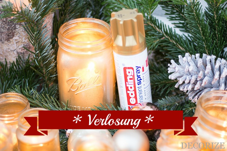 Zusammen mit Lieblingsglas und edding verlosen wir ein “Winterleuchten”-Set, bestehend aus 5 verschieden großen Ball Mason Jars plus einer Flasche edding Permanent Spray “Rich Gold” an eine/n von Euch für Eure Indoor oder Outdoor Winterdeko. Dafür müsst ihr mir nur weiter unten Euren Kommentar hinterlassen und mir sagen, wer Eurer Meinung nach diesen Winter unbedingt mal auf einen heißen Kakao und ein Pläuschchen neben mir auf der Bank vor meinem Haus Platz nehmen sollte. Brad Pitt steht schon auf meiner Liste… ;-)