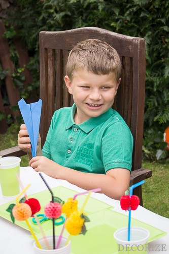 Den guten Garten-Holztisch hatten wir übrigens vorausschauender Weise vorher mit Papier-Tischdecken (gibt’s auch von Susy Card) in weiß und grün ausgelegt. Das passte erstens hervorragend zu den grünen Tellern, Bechern und Servietten und hat zweitens Klebstoff und viele bunte Farben vom Holz ferngehalten. Zum Glück :-)
