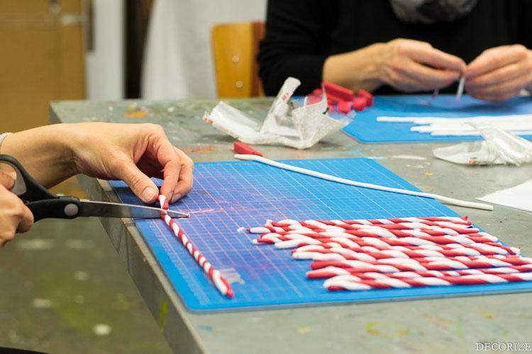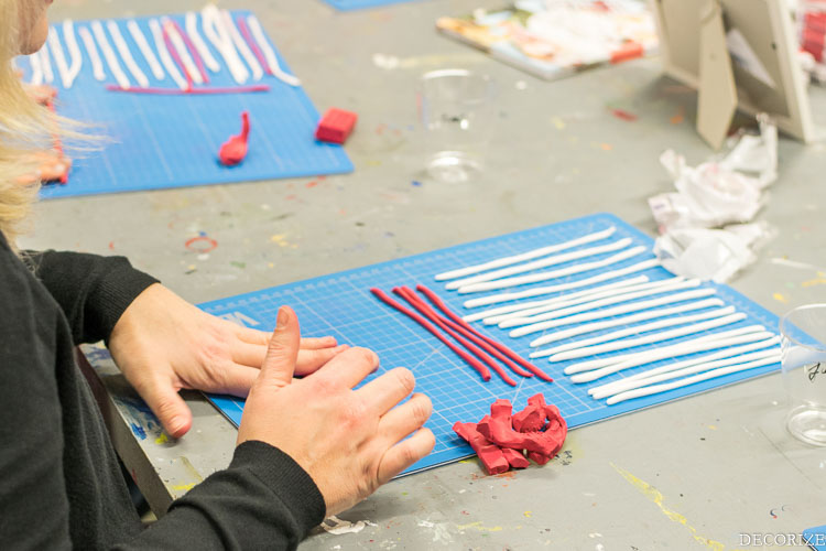 Auf den Bildern weiter unten von unseren Workshop-Teilnehmerinnen seht Ihr schon, wie das grundsätzlich funktioniert mit den Fimo Zuckerstangen. Ihr braucht rotes und weißes Soft-Fimo, welches Ihr dann erst separat und dann zusammen um einander dreht. Dann wandert das Ganze in den Backofen zum Aushärten. Es ist ganz einfach, eine detaillierte Step-by-Step Anleitung haben wir Euch hier zum Download vorbereitet: