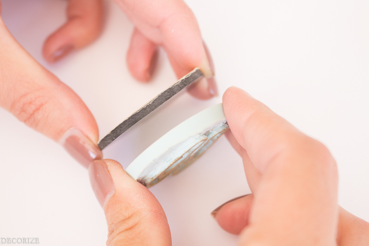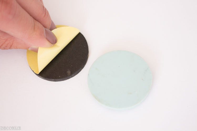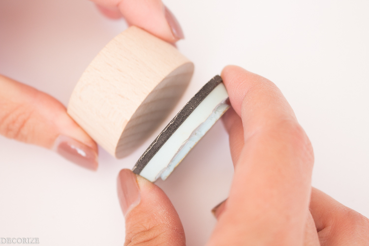 Mit Hilfe der doppelseitigen Klebepads bringst du nun das Stempelgummi auf den Holzuntersatz.