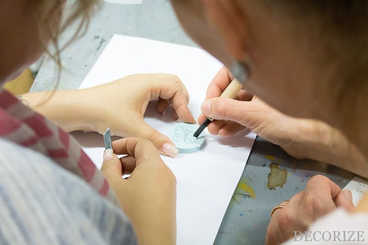 Die Teilnehmerinnen auf unserer letzten Kreativ-Party “Summertime” durften auch gleich ran an die Schnitzwerkzeuge und haben sich viele tolle Motive ausgedacht, die sich gut auf Stempeln machen. Von Sprechblasen bis Namen und Schriftzügen sowie Eistüten war alles dabei. Als besonders praktisch hat es sich dabei erwiesen, das Handy zur Hilfe zu nehmen und online nach hübschen Motive zu suchen, die man dann direkt vom Display mit Transparentpapier abpaust. Ganz schön clever, die Mädels, was?