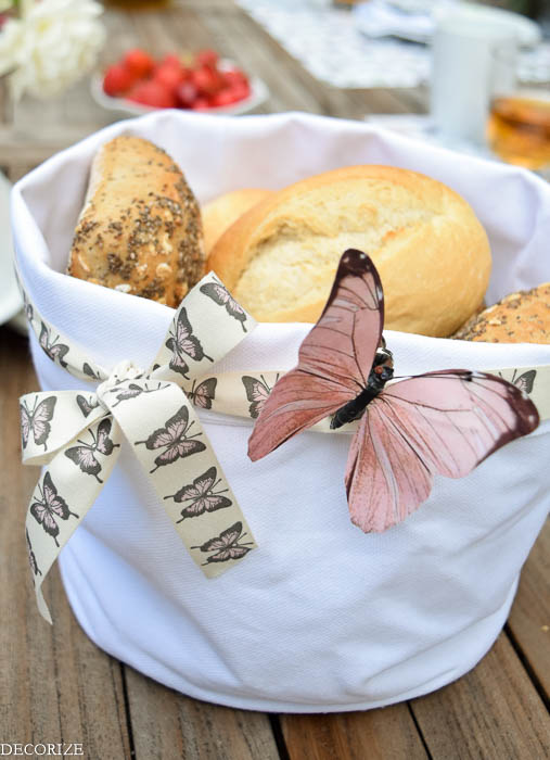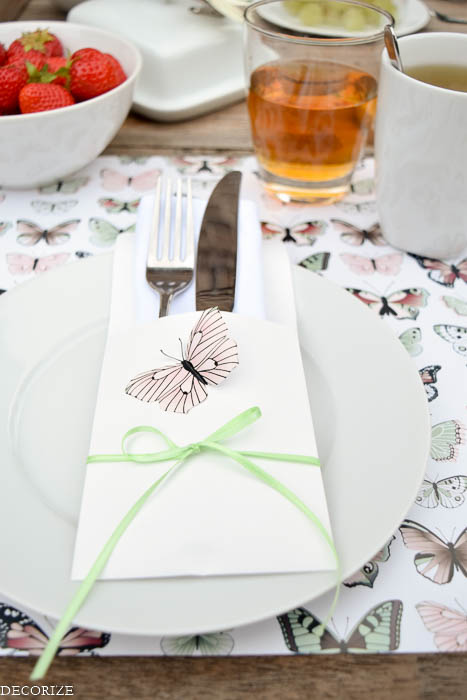 Diese ausgeschnittenen Schmetterlinge könnt Ihr dann überall befestigen, wo es Euch gefällt. Am Brötchenkorb, an der Butterdose, an Tasse und Teller usw.