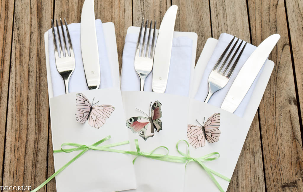 Aus dem Geschenkpapier haben wir uns noch einige Schmetterlinge ausgeschnitten, einen Flügel leicht hochgeklappt und auf Bestecktaschen geklebt. So sieht es schön plastisch aus und fast ein bisschen, als ob sich ein echtes Flattertierchen niedergelassen hätte.