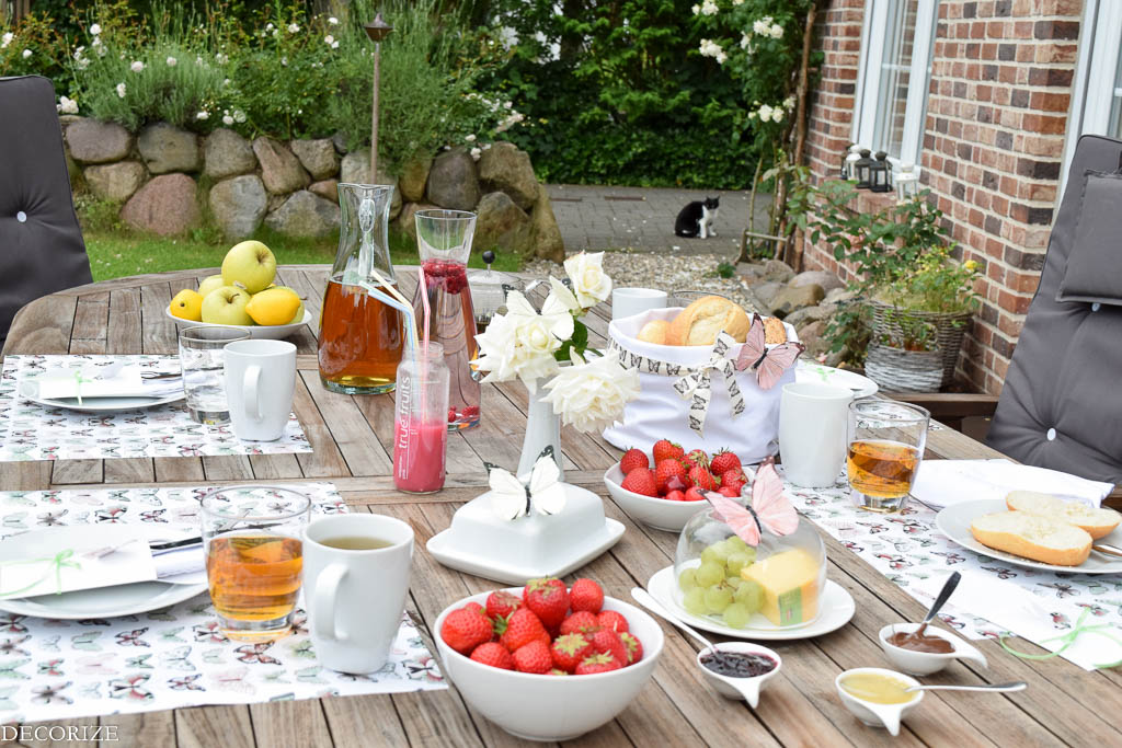 Wir haben für unseren Brunch-Tisch Geschenkpapier mit vielen, bunten Schmetterlingen drauf gewählt und daraus einfach Stücke im Maß von ca 35 x 45cm geschnitten. Das könnt Ihr aber machen wir Ihr möchtet, auch runde oder ovale Sets sind hübsch oder größere oder kleine. Ganz wie es für Euch und eure Tischdeko am besten passt.