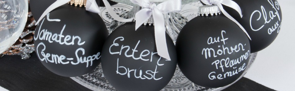 Uns wären ganz viele tolle Dinge eingefallen, wie wir sie hätten einsetzen können (neben dem klassischen in den Baum hängen) und haben uns schlussendlich für den Einsatz als Menüträger entschieden. Es sieht so schön aus in der Mitte des Tisches und hebt das Weihnachtsmenü so richtig toll heraus, findet ihr nicht auch?