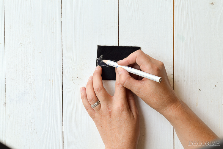 1.) Drucke dir unsere Fledermaus Vorlage auf festem Papier aus. Falte ein Stück schwarzen Filz , so das es doppelt liegt. Die Fledermaus-Schablone legst du nun auf den doppelt liegenden Filz und zeichnest mit einem weißen Kreidestift die Umrisse auf den Filz.