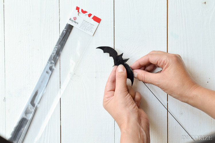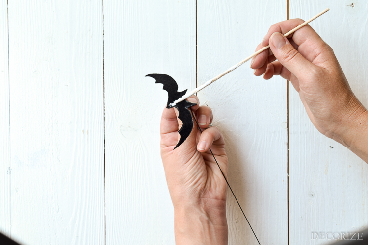 3.) Nun nimmst du dir einen langen Draht und piekst ihn von unten durch den Kopf der Fledermaus und von oben wieder nach unten durch den Schwanz. Auf der Unterseite drückst du den überschüssigen Draht einfach zusammen, damit er nicht absteht.