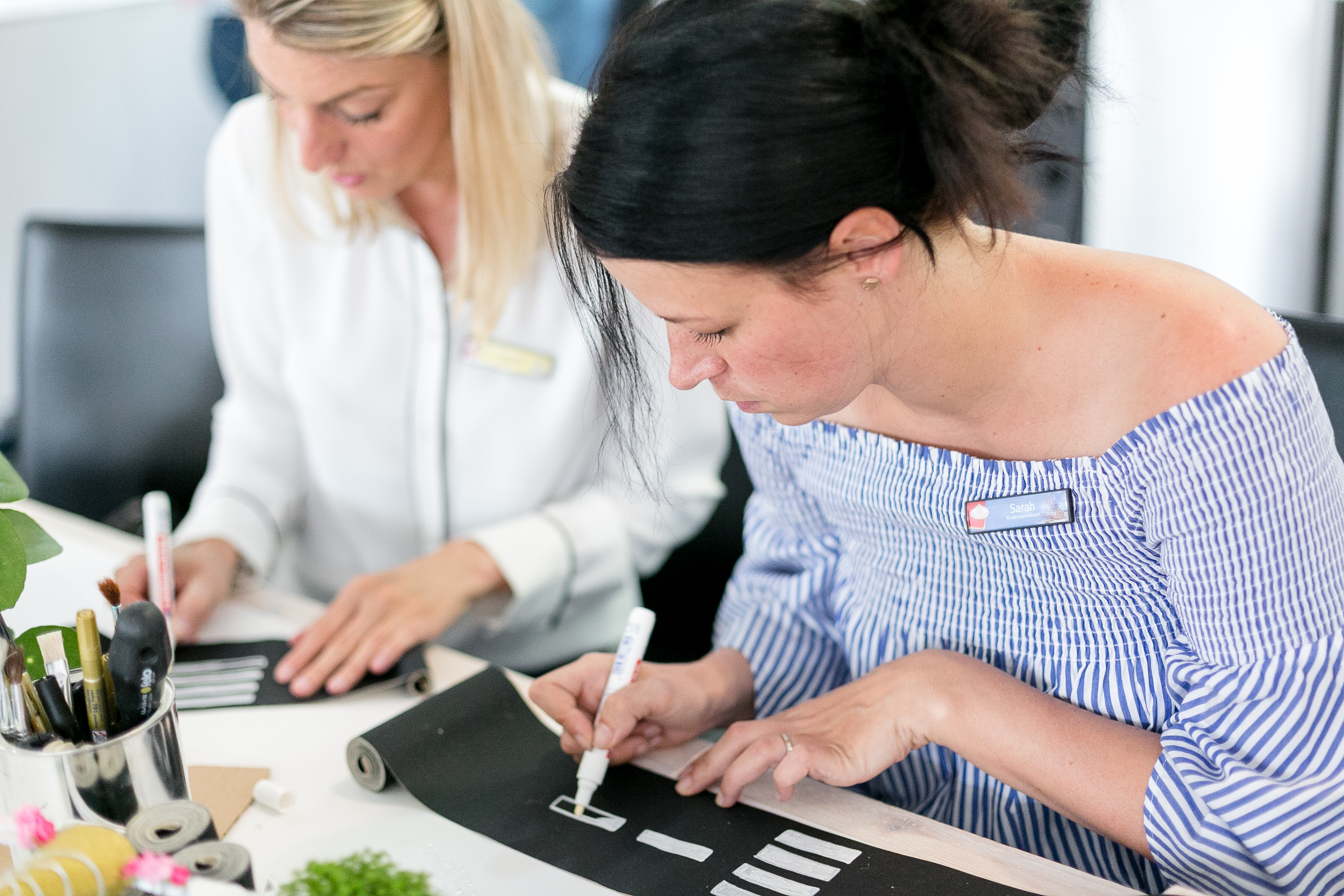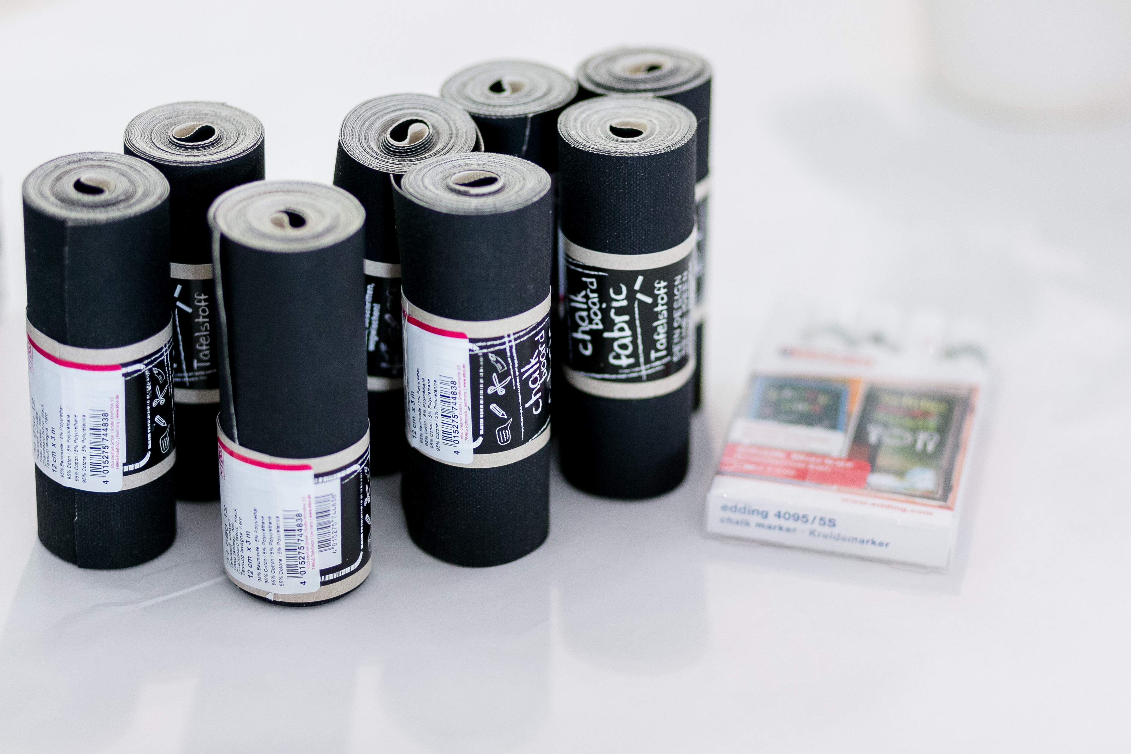 Die Grundlage für den Tischläufer ist Tafelstoff. Perfekt geeignet ist der Tafelstoff von Halbach, der mit seinen 12cm Breite und 3m Länge schon gleich die perfekten Maße mitbringt. Auf diesen braucht Ihr dann nämlich nur noch mit Kreidestiften (z.B. von edding) mittig und in gleichmäßigen Abständen die Fahrbahn und Zebrastreifen malen und fertig ist Eure Rennstrecke!