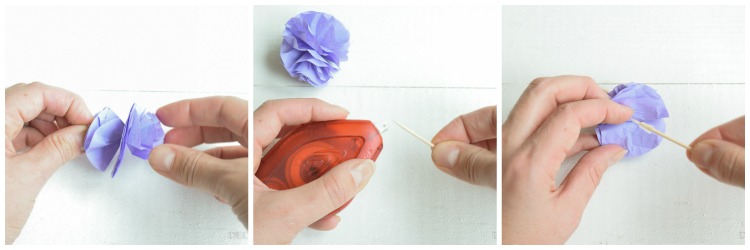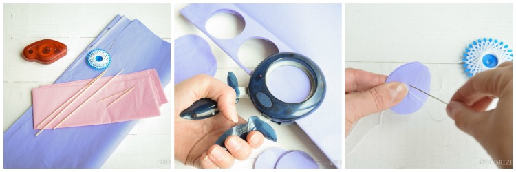 Einfach Seidenpapier, Kreisstanze, Nadel und Faden sowie Kleberoller und Holzspieße schnappen und das Seidenpapier in mehrere Lagen falten. Unsere Stanze macht bei mehr als 8 Lagen schlapp, vielleicht ist Eure ja noch besser geschärft. Auf jeden Fall braucht Ihr mindestens 16 Kreise übereinander, die ihr dann mit einem Faden zusammen “näht”. Einfach die Nadel einmal in der Mitte durch und wieder zurück stechen und den Faden verknoten.
