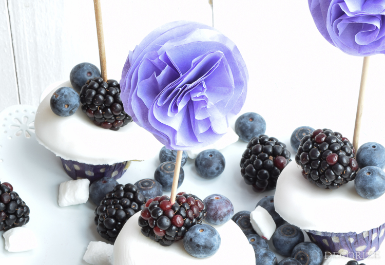 Und dann wird geplustert: erst 8 Kreise in die eine Richtung “zusammenknüllen” und dann 8 zur anderen Seite. Mit dem Kleberoller gebt Ihr dann ein wenig Kleber auf den Schaschlikspieß oder Zahnstocher und steckt diesen zwischen Eure genähten Fäden. Gut festdrücken und rein in Kuchen, Brownies, Torte oder Cupcakes.