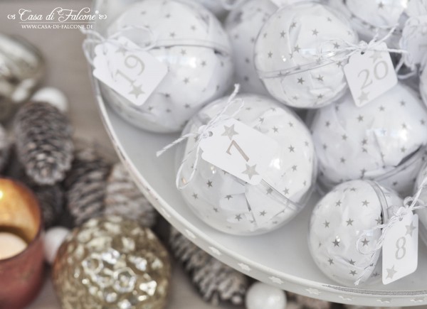 Los geht’s mit einem kugelrunden Adventskalender, auf den wir bei Anna von Casa di Falcone gestossen sind. Er lässt sich toll auf dem Tisch dekorieren und sieht mit seinen grau-weißen Farben einfach zauberhaft aus. Hätten wir für uns nicht schon einen anderen Adventskalender in Arbeit, würden wir diesen sofort nachbauen! #Note to myself: gleich vormerken für nächstes Jahr #