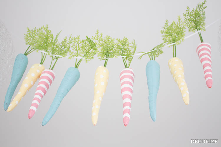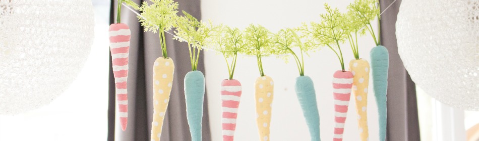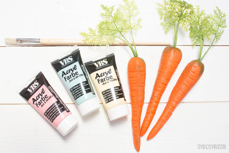 Drauf gekommen auf die tolle Idee sind wir neulich bei einem Bummel über die Nordstil-Messe hier bei uns in Hamburg. Wir kamen am Stand von Krima & Isa vorbei, der schon super hübsch nach Ostern aussah. Unter anderem hing auch eine bemalte Möhrengirlande als Deko im Fenster, in die wir uns sofort verliebt haben. Deshalb haben wir uns zurück im Büro gleich selbst an die Farbteller gesetzt, Kunststoff-Möhren bestellt und die gute Idee nachgemacht.