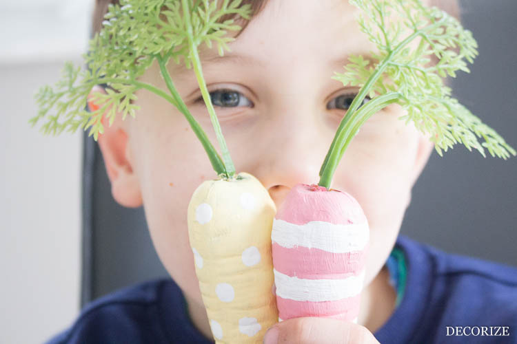 In der nächsten Runde haben wir den rosa Möhren noch ein paar Ringel und den gelben noch weiße Punkte verpasst, weil das Anmalen gerade so Spaß gemacht hat.