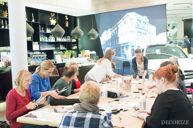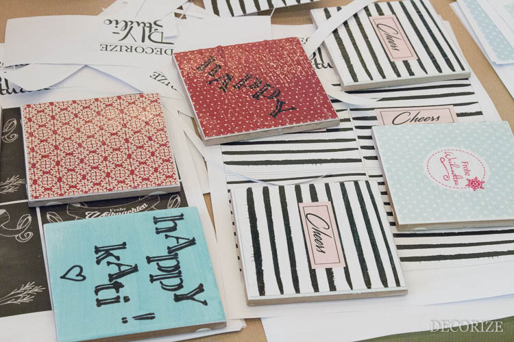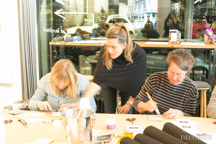 Wir hatten Fliesen und Bastel-Material für alle dabei und auch eine Auswahl an Designs zum Gestalten. Viele der Teilnehmer brachten allerdings auch eigene Ausdrucke mit tollen Designs mit und so entstand eine bunte Mischung an komplett unterschiedlichen Glasuntersetzern. Großartig! Die kann man wirklich schnell & einfach auch zu Hause selber machen. Wie das genau funktioniert, haben wir in unserem Buch “Wir feiern” schon einmal im Dinner-Party-Thema gezeigt. Wer das grad nicht zur Hand hat, kann sich hier die Anleitung: Anleitung Coaster kostenlos downloaden. Und hier gibt’s heute unsere Designs aus dem Workshop als kostenlosen Download: Coaster-Designs. Es ist wirklich ganz easy, und es entstehen wirklich tolle Hingucker auf jedem gedeckten Tisch.