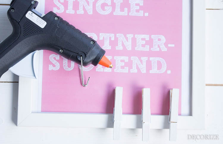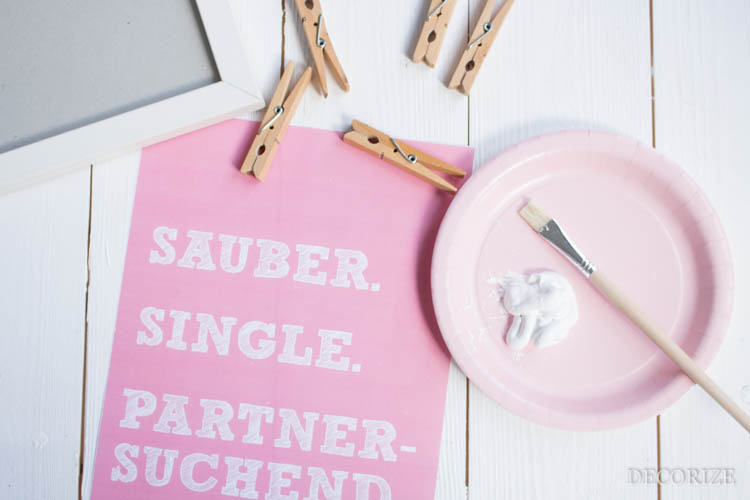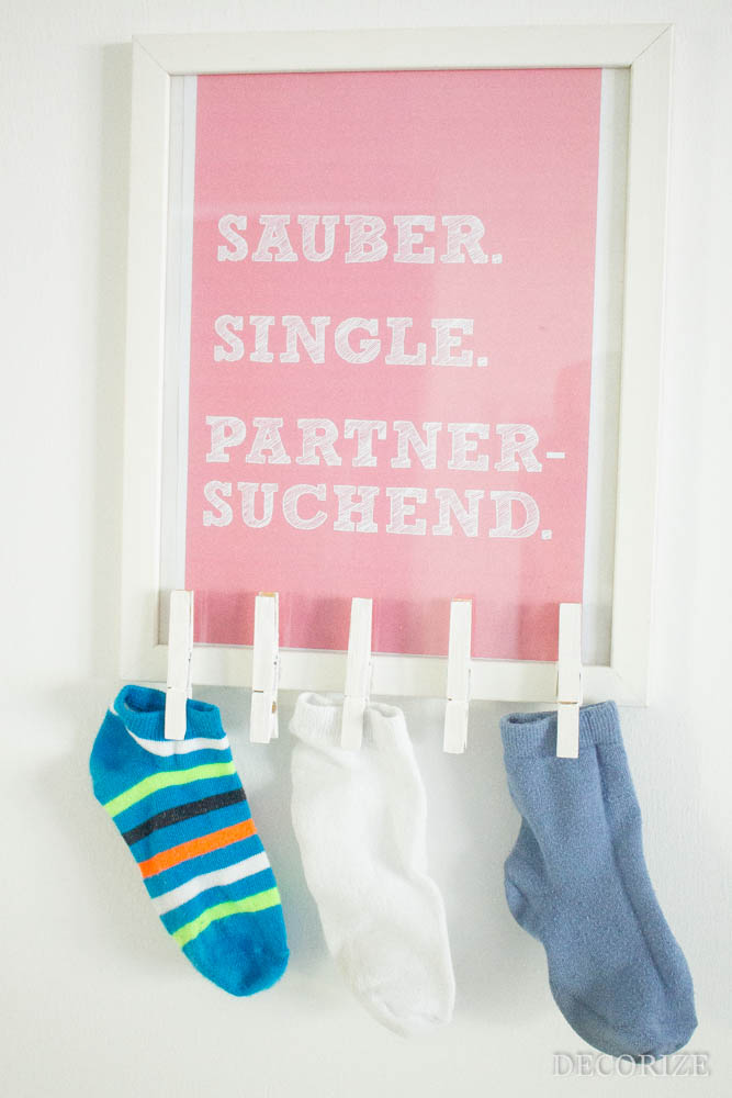Wir haben dafür einen schlichten, weißen Bilderrahmen (mit glattem Rahmen) genommen und zuvor weiß angemalte Wäscheklammern mit der Heißklebepistole dran geklebt. Das Bild für den Rahmen war schnell gemacht, wer es herunterladen möchte, kann es hier tun Sockenbild Layout.