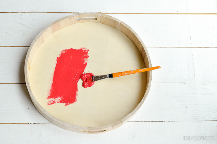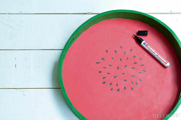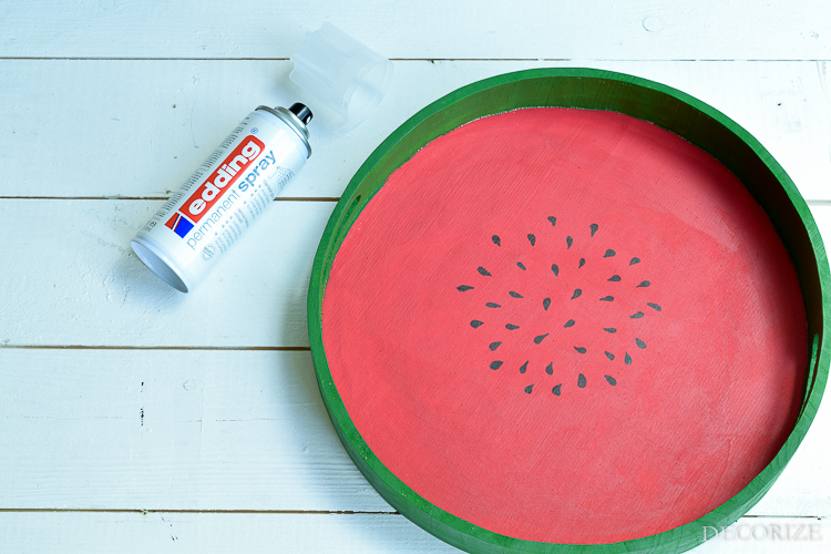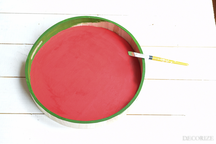 Als erstes malt Ihr den Boden des Tabletts mit roter Farbe und den Rand (innen und außen) mit grüner Farbe an. Wer den Übergang nicht so frei aus der Hand malen möchte, kann sich – nachdem er den Boden rot gemalt hat und die Farbe getrocknet ist – die Kante mit Washitape abkleben, um nicht überzumalen.