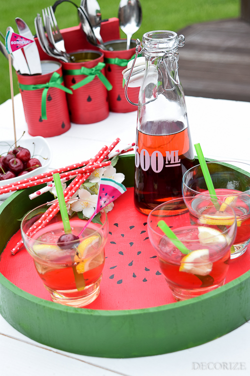 Ist es bei Euch auch so herrlich sommerlich? Pünktlich zum Ferienstart ist hier wieder Mega-Sommer! So richtig perfekt für Freunde im Garten, leckere Getränke und tolle Deko. Macht mal kurz die Augen zu und stellt Euch ein paar kühle Drinks vor, hört Ihr die Eiswürfel in den Gläsern klingen? Und riecht Ihr den leichten Duft von Limette? Und jetzt macht mal die Augen schnell wieder auf und seht Euch mal das Tablett an, mit dem die Drinks gerade gebracht werden! Wer uns diesen Sommer schon ein wenig verfolgt, weiß, was jetzt kommt: M.E.L.O.N.E.