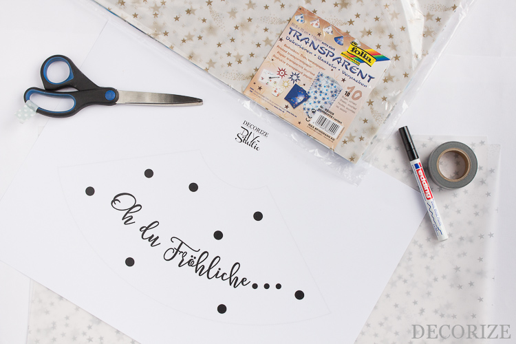 - Schritt 1: Legt Euch Vorlage, Transparentpapier, Schere, edding und Washitape bereit