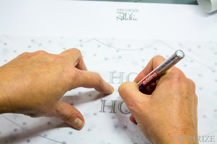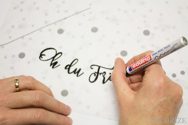 - Schritt 3: Paust Schrift und Muster je nach Bedarf und Wunsch ab und übertragt es mit dem edding aufs Transparentpapier. Dabei die Außenlinien nicht vergessen!