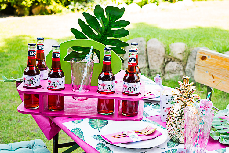 Ein toller Hingucker auf dem gedeckten Tisch ist ein DIY Getränkehalter aus Holz, den Ihr wie wir in pink und grün anmalen könnt. Den Getränkehalter gibt es als cooles DIY Set inklusive easy Bauanleitung bei Twercs, einfacher geht es kaum!