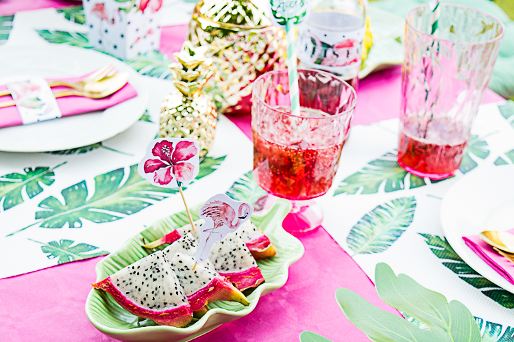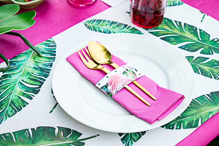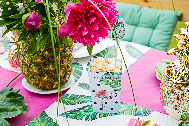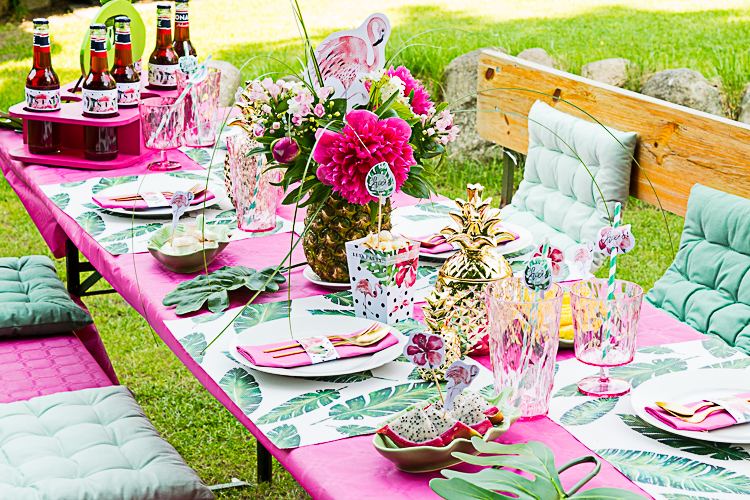 Wenn Ihr Euch unseren Tisch anseht, fällt Euch gleich auf, dass er im Grunde nur von 2 Farben dominiert wird: pink und grün. Habt Ihr eine Tropical Party bei Euch geplant, schaut Euch also rechtzeitig im Handel um nach Accessoires und Deko in diesen 2 Farben. Im Sommer gibt es außerdem in vielen Deko-Fachgeschäften tolle Accessoires mit Palmenblättern wie z.B. Tischsets oder kleine Schälchen. Die müsst Ihr unbedingt haben, die sehen toll aus auf einer Tropical Party!