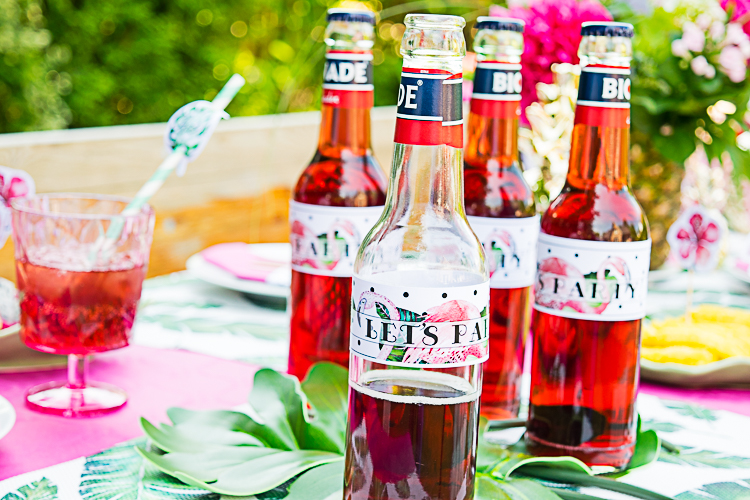 Um die Flaschen werden dann coole Flamingo-Papierbanderolen aus unserem Printable-Set geklebt. Das Set, in welchem außer den Banderolen auch noch Girlande, Food Pieker, Strohhalmfähnchen, Flamingo-Stecker, Serviettenbanderolen und Snackboxen enthalten sind, könnt Ihr hier herunterladen: