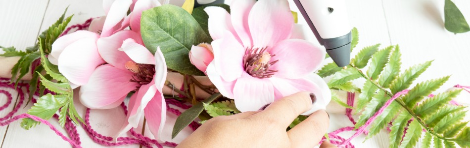 - ggf. Zahnstocher zum Durchstubsen der Kordel und Festdrücken der Blumen in den Heißkleber