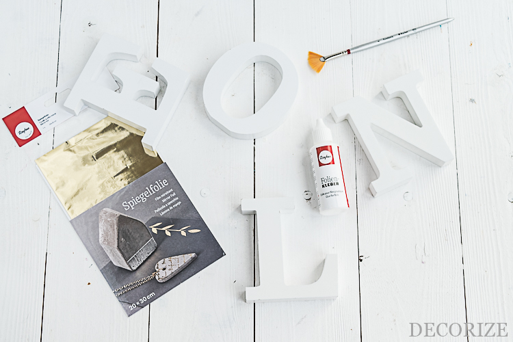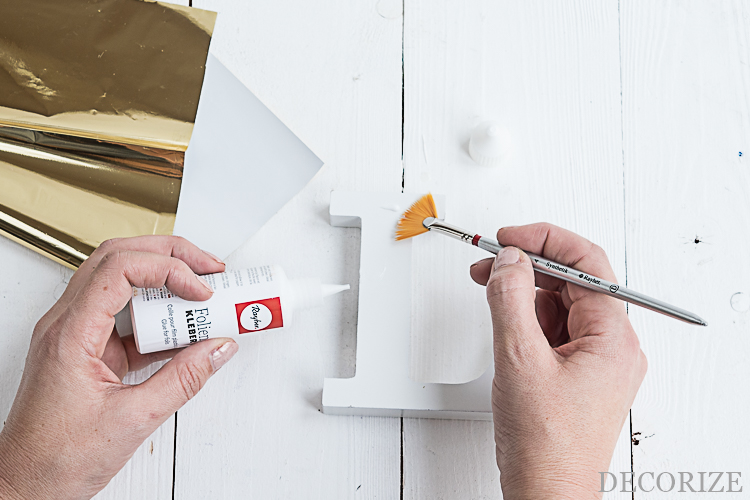 Tragt den Folienkleber mit einem Pinsel dünn auf die Vorderseite Eurer Buchstaben auf und lasst den Kleber gut antrocknen.