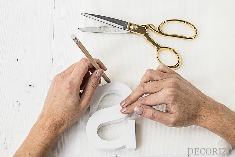 Legt das Plüsch mit der Rückseite nach oben vor Euch auf den Tisch und platziere den ersten Buschstaben darauf. Mit einem Bleistift zeichnet Ihr nun die Silhouette der Buchstaben auf den Plüsch nach.