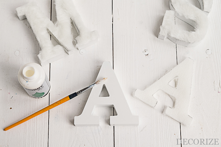 Das Gleiche macht Ihr mit den anderen Buchstaben ebenso. Dann dreht Ihr die Buchstaben auf die richtige Seite und pinselt sie mit Bastelkleber ein. Nun könnt Ihr das Plüsch auf Eure Buchstaben aufkleben.